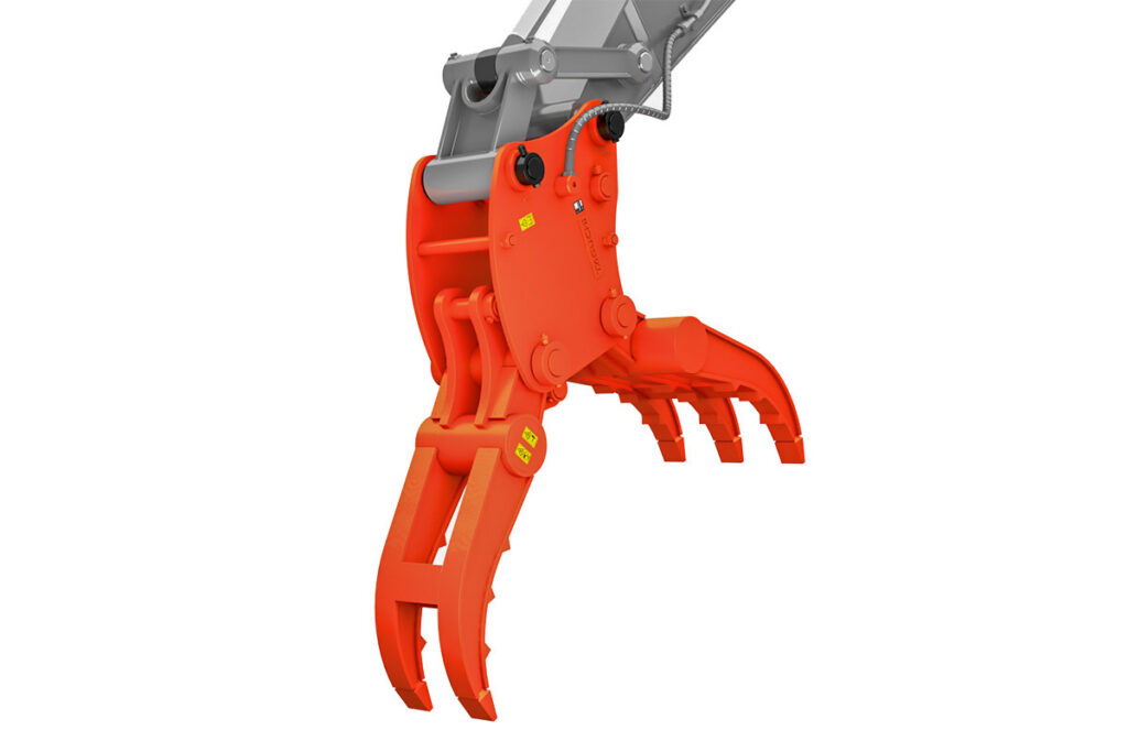 つかんだままチルトさせることができるので、積み荷作業も安全に行うことが可能です。本体内部の油圧シリンダで爪が開閉するので、操作もいたって簡単。ピン2本の簡単脱着で、取替時間も大幅に短縮できます。